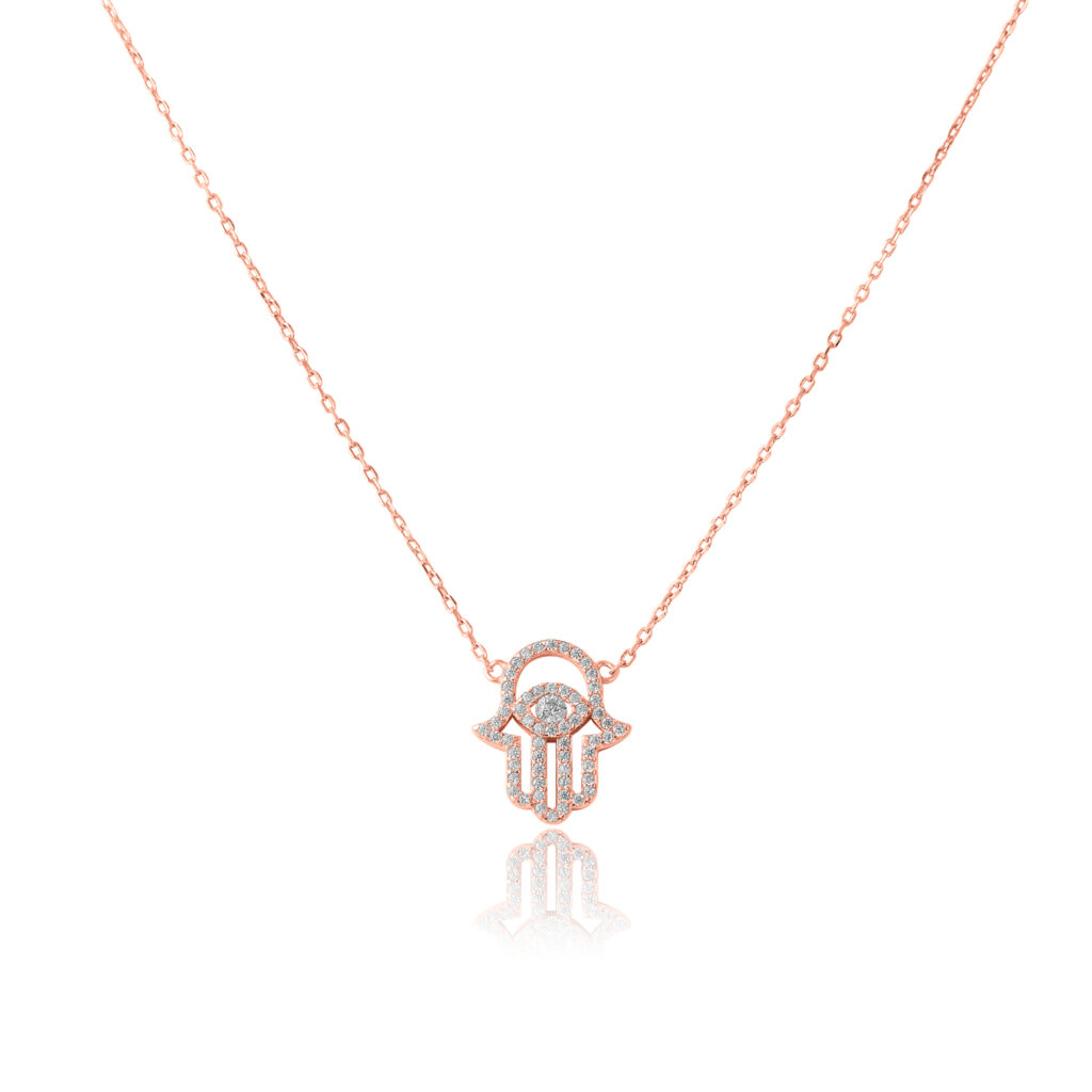 הפכי כל לוק לנוצץ ומיוחד עם שרשרת ציפוי רוז גולד עם תליון חמסה משובץ אבני חן.  מוסיף חמימות ואלגנטיות לכל הופעה. השרשרת מושלמת לשדרוג המראה היומיומי או לאירועים מיוחדים.