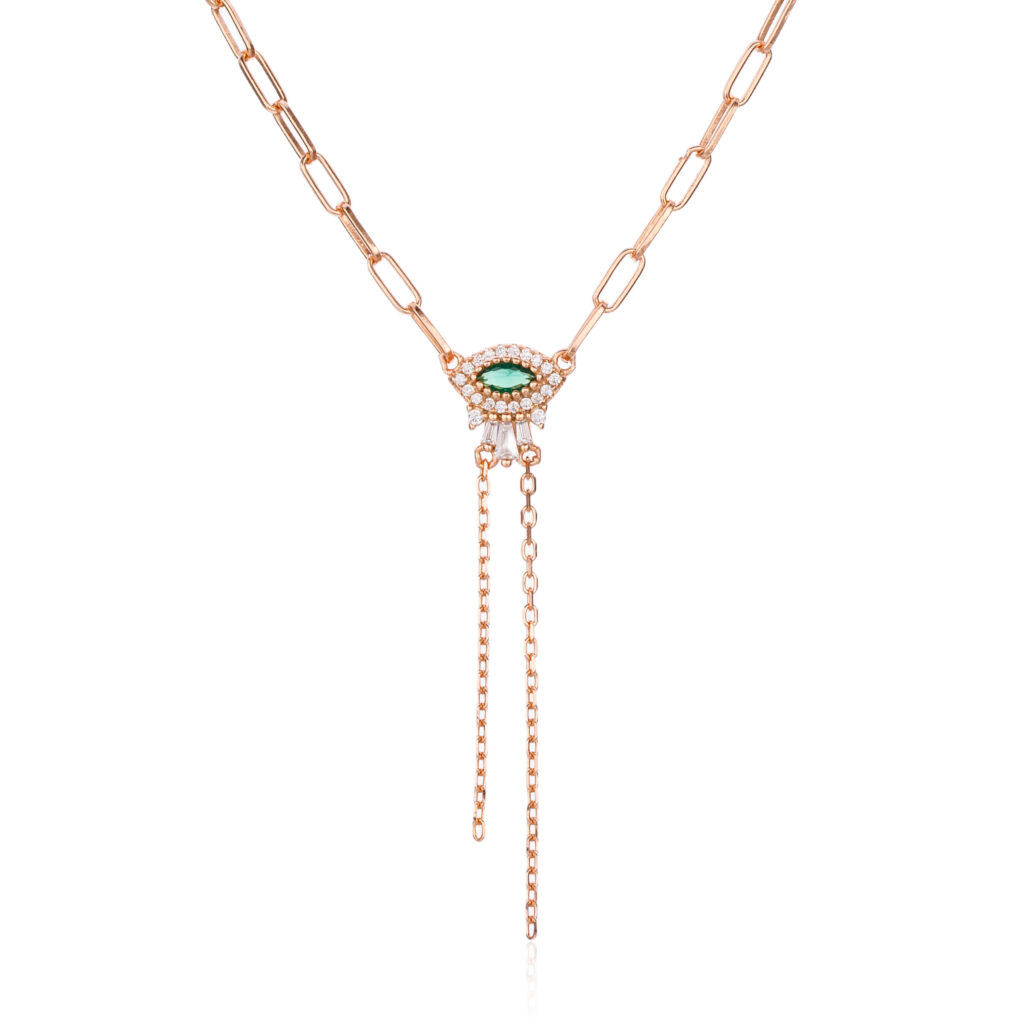 תני ללוק שדרוג מלא בסטייל של שרשרת עניבה מרוז גולד 14 קראט עם תליון עין.