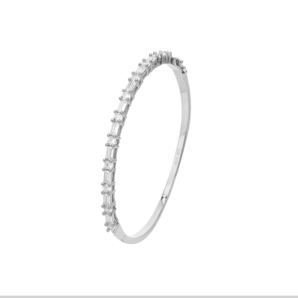 צמיד קשיח עשוי כסף סטרלינג 925, המעוצב בקווים נקיים ואלגנטיים, המעניקים לו מראה יוקרתי ומרשים. הצמיד משובץ באבני חן שקופות ומנצנצות, המוסיפות ברק ותחכום. אידיאלי לאישה המעוניינת בתכשיט שמספק מראה מתוחכם ואפנתי, המתאים לכל אירוע.